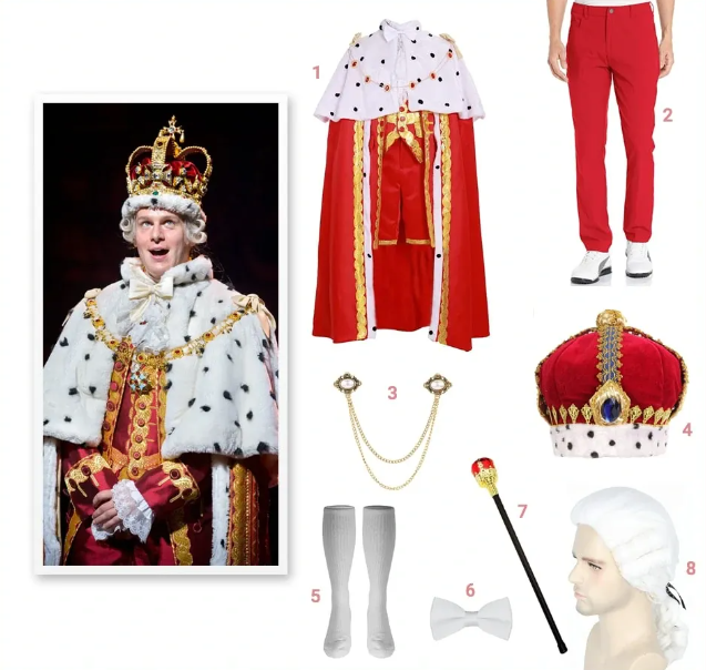 Verwandle dich in den berühmten verrückten König, wenn du King George III aus Hamilton cosplayst. Wenn du keine Angst vor Accessoires hast und die Pracht und das Pompöse beim Verkleiden liebst, dann ist dieses Ensemble das perfekte Aussehen für dich! Trage einen königlichen Plüschmantel mit einem weißen äußeren Umhang und einem roten Innenumhang. Darunter kannst du bequeme rote Hosen tragen und auf deinen königlichen Füßen kniehohe Socken, die zu einem klassischen weißen Schuh passen.