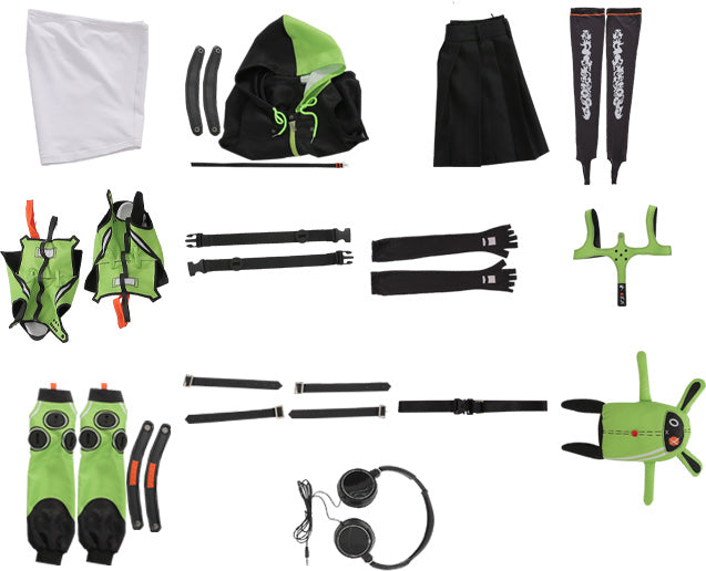 Im Lieferumfang enthalten: 1 Weste, 1 Jacke, 1 Rock, 2 Socken, 2 Schuhüberzüge, 2 Beinringe, 2 Handschuhe, 1 Träger, 2 Ärmel, 4 Handgelenkringe, 1 Gürtel, 1 Puppe